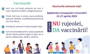 Regiunea Europeană a Organizației Mondiale a Sănătății (OMS) marchează în perioada 21 – 27 aprilie 2024 cu genericul ”Vaccinarea protejează generații”, având scopul de a crește gradul de conștientizare cu privire la importanța vaccinării în prevenirea bolilor și protejarea vieții.