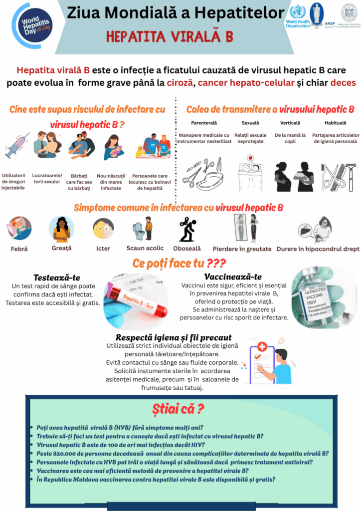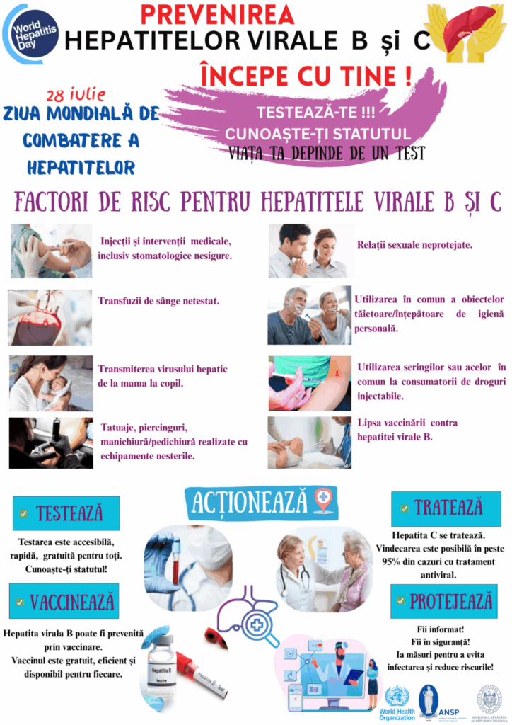 Astăzi marcăm Ziua mondială de combatere a hepatitei. Tema evenimentului din acest an este „Hepatita: Să o analizăm. Să o depășim”. Este o zi recunoscută de Organizația Mondială a Sănătății (OMS) pentru a crește gradul de conștientizare despre hepatitele virale (A, B, C, D și E), care afectează milioane de oameni în întreaga lume.
